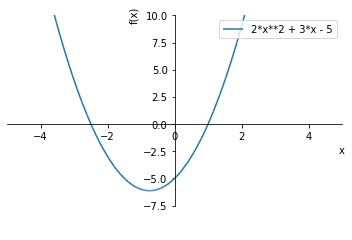 plot(2*x**2 + 3*x - 5, (x, -5, 5), ylim=(-10, 10), legend=True) # 그래프 (sympy)