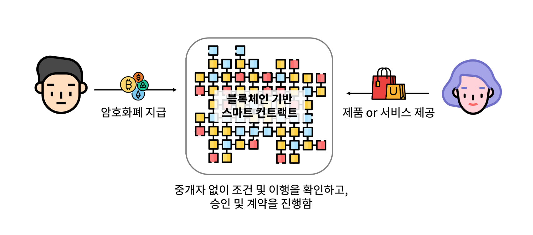 즉, 정해진 조건을 만족하는 즉시 자동으로 계약이 체결되는 것이다. 스마트 계약은 암호화된 코드로 블록체인 네트워크에 기록되므로 그 누구도 처음에 기록된 조건을 바꿀 수 없다.