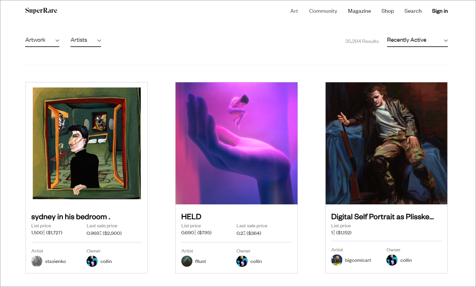 슈퍼레어에서 NFT 구매를 원하는 사람은 이더리움을 사용해 살 수 있으며, 판매 수수료는 15%로 다소 높은 편이다.