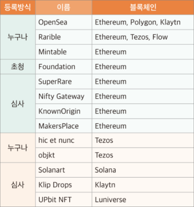 NFT 마켓플레이스는 크게 누구나 자유롭게 작품을 올릴 수 있는 곳과, 초대로 가입할 수 있는 곳, 심사를 통해 가입할 수 있는 곳으로 나뉜다.