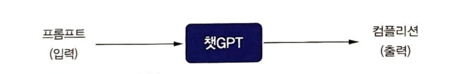 챗GPT의 동작 원리는 그림과 같이프롬프트 (Prompt)라는 질의를 입력하면 챗GPT가 그에 대한 대답으로 컴플리션 (Completion)을 보여 준다.