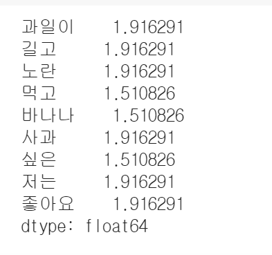 ▷ IDF (Inverse Document Frequency) 는 DF 의 역수이며, 특정 단어가 발견되는 문서의 수를 뜻한다.