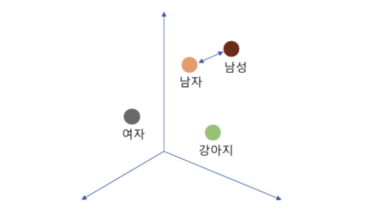 그렇지만, 분산표현 방식에서는 벡터 공간 상에 유사한 의미를 갖는 단어들은 비슷한 위치에 분포되어 있기 때문에, '남자'와 '남성'이라는 단어 위치는 매우 가까우며, 같은 의미로 해석할 수 있다.
